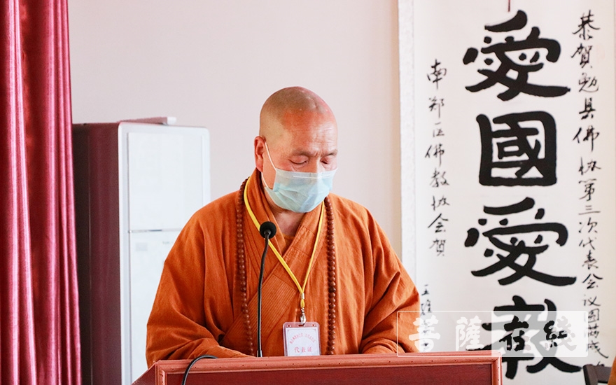 陕西省佛教协会住会副秘书长、汉中市佛教协会副会长兼秘书长本光法师代表汉中市佛协致辞。他向新一届领导班子提出四点建议:一是加强自身素质,二是重视道风建设。三是转变弘法观念,四是积极开展公益活动。