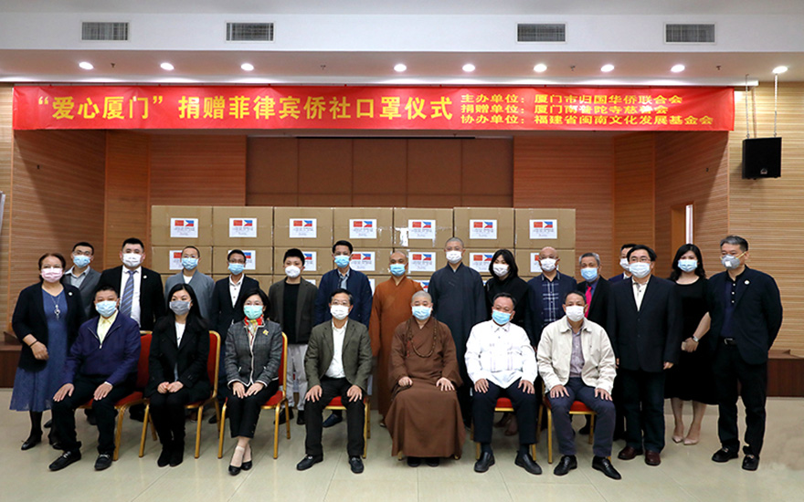 厦门市委副书记陈秋雄,南普陀寺慈善会会长则悟大和尚,厦门市侨联主席潘少銮,福建省闽南文化发展基金会副会长叶梓分别向菲律宾大乘信愿寺、菲律宾厦门联谊会、菲律宾福建总商会,中信慈善基金会,菲律宾总统特使图尔福(Ramon Tulfo)办公室、菲律宾海岸警卫队等11家有关机构捐赠口罩。