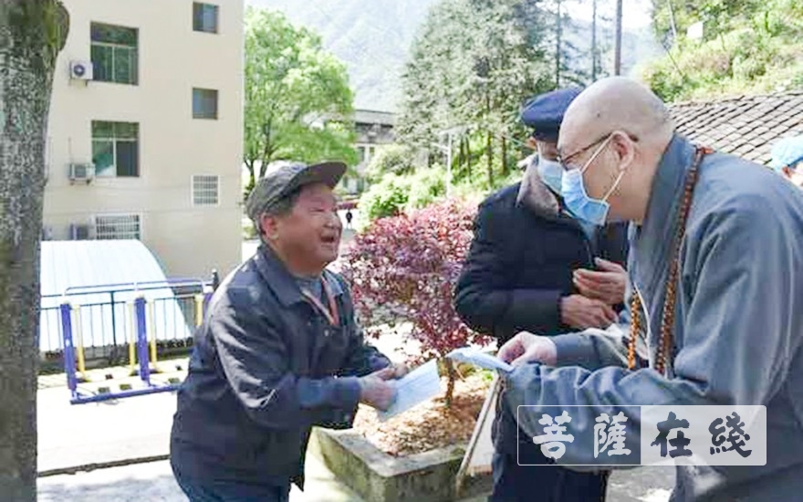 菩萨在线湖南讯 4月14日,在湖南省佛教协会会长、湖南省佛慈基金会理事长圣辉法师带领下,湖南省佛协永觉法师、宁乡密印寺贤心法师、湖南省佛协副会长兼佛慈基金会秘书长周仲山、常务副秘书长陈旭等一行人前往位于益阳安化大福皮肤病防治所,在湖南省疾控中心麻防科科长旷燕飞、副科长陈欢、大福皮肤病防治所所长蒋雄辉的陪同下,看望慰问了居住在此的十多位曾患麻风病(已治愈)的孤残老人,给他们送去慰问金及防疫口罩、食用油、粮食、消毒用品和新衣服,并现场向防治所捐赠善款3万元。