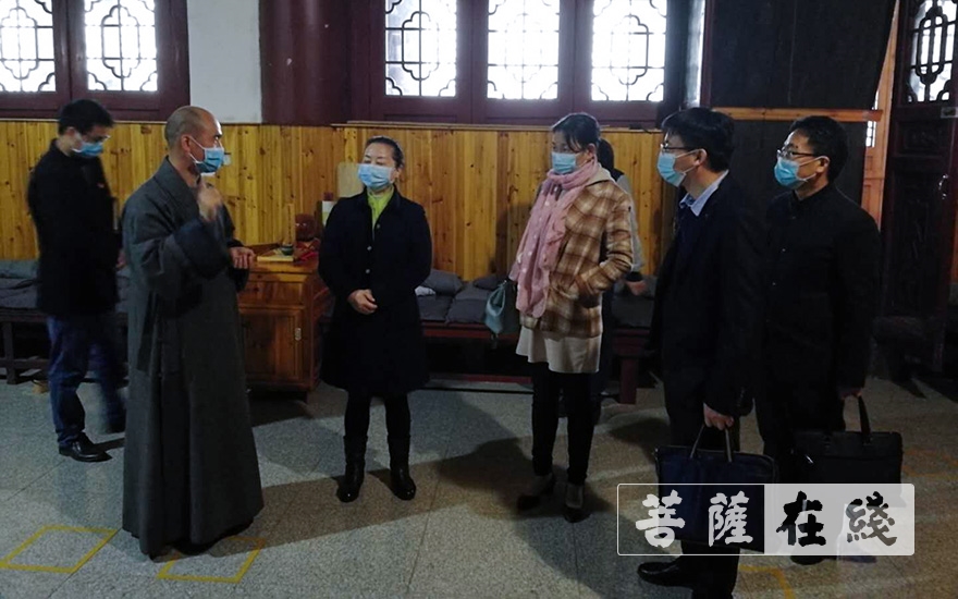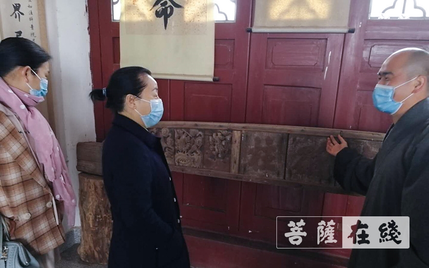法如法师向黄声兰介绍宝台古寺各殿堂建筑以及寺院情况,汇报寺院自1月24日开始,坚决贯彻执行政府关于新型冠状病毒肺炎疫情的防控规定,暂停对外开放。同时南康区佛教协会各寺院法师及居士向社会捐款4万余元支援抗疫。