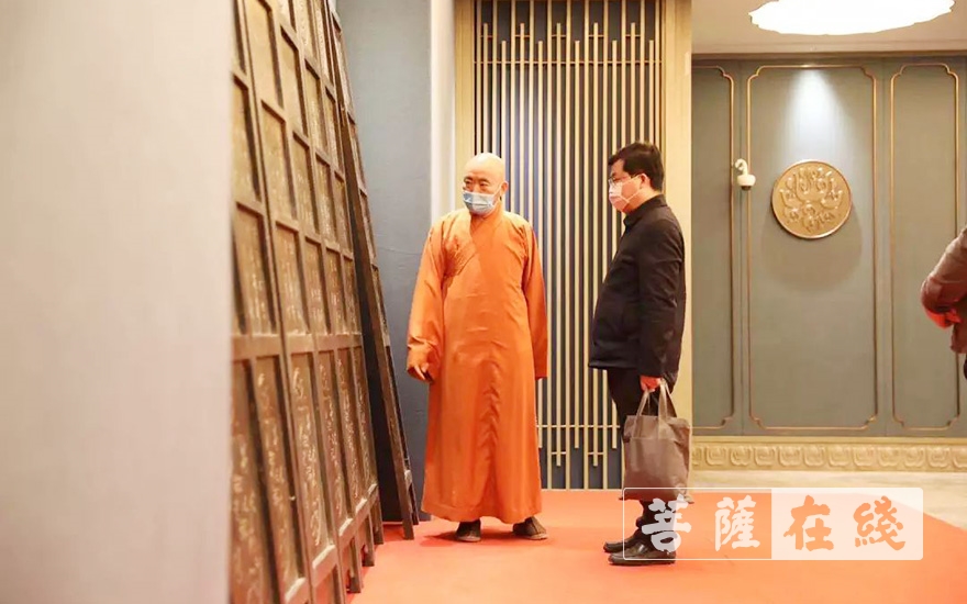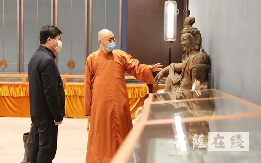 王罗清抵达寺院后,重点考察了寺院东厢房整体设施,以及西厢房一、二楼佛教艺术展示厅。平熹大和尚简要汇报了寺院近期工作要点、疫情防控措施、及宁国素斋复工复产情况,王罗清处长对宁国禅寺近期的工作成效表示充分肯定。考察完毕后,双方在三楼丈室落座交谈。