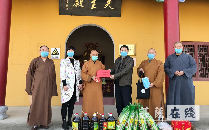 天通法师也通过各种渠道购买口罩近千个,酒精100多斤,并让常住居士购买1000多斤面粉,炸了大量萝卜圆子作为物资。他率副会长兼秘书长心广法师、副会长西来法师带着这些防疫物资、萝卜圆子等,于3月1日、3月5日走访了全市各县市区(除宿松县因道路未解封外)一些寺院,看望各地佛协领导和普通僧众,送去佛协的爱心物资,表示亲切慰问。