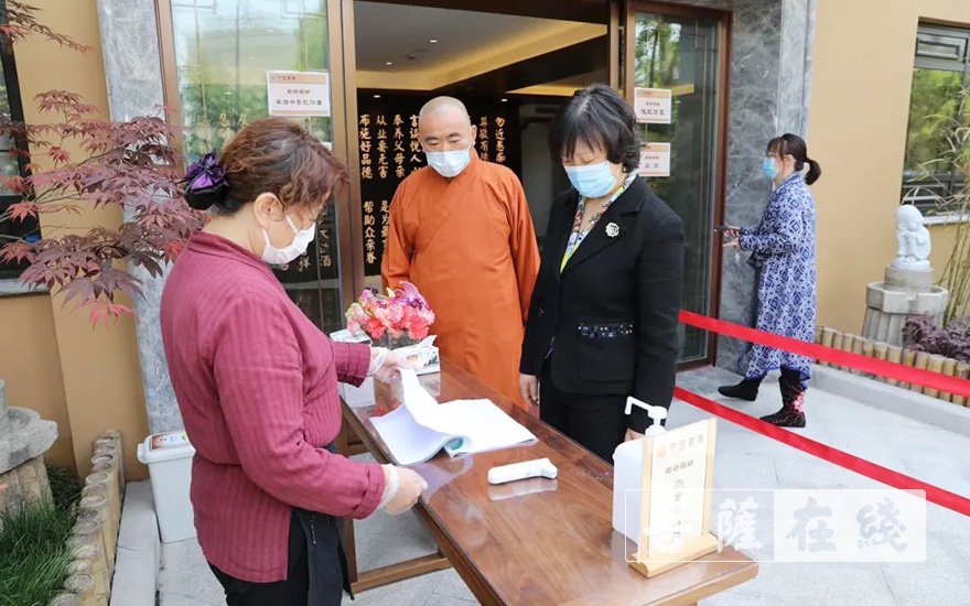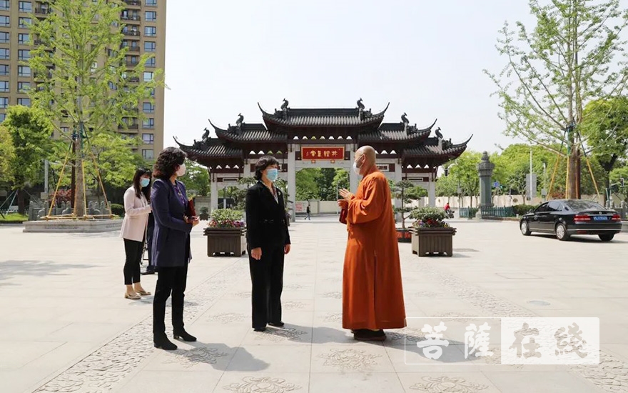 菩萨在线上海讯 4月26日,徐汇区人民政府副区长秦丽萍一行赴宁国禅寺视察寺院疫情防控和复工复产情况。宁国禅寺方丈平熹大和尚热情迎接领导。