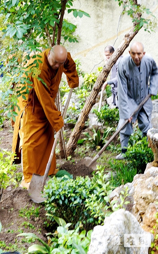 菩萨在线江苏讯 4月19日,果光大和尚带领全寺法师,在兴化寺洞天小庐院以及塔林周围种下桂花树、茶花树、石楠、樱桃树等十余种树木和花卉,践行 “绿水青山就是金山银山”、“山水林田湖草是生命共同体”的指示要求,弘扬佛教农禅并重传统。
