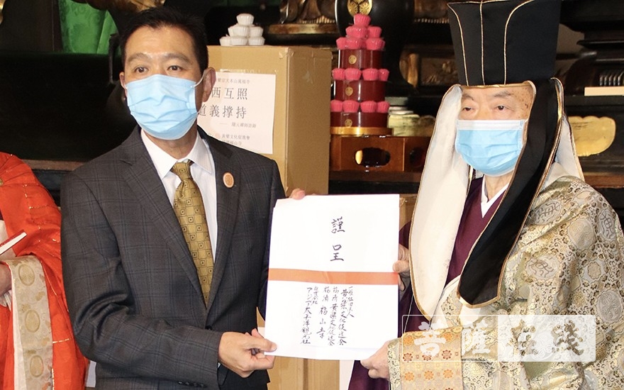 日本黄檗文化促进会理事长、日中福清工商会名誉理事长陈熹代表捐赠方出席在京都宇治万福寺举行的捐赠仪式菩萨在线海外讯 4月17日,从日本黄檗文化促进会福清办事处获悉,疫情期间,日本黄檗文化促进会向日本京都宇治万福寺、黄檗文化研究所、日本服饰文化研究会、高野山真言宗总本山金刚峰寺等处捐赠口罩,此举得到受捐单位一致感谢。