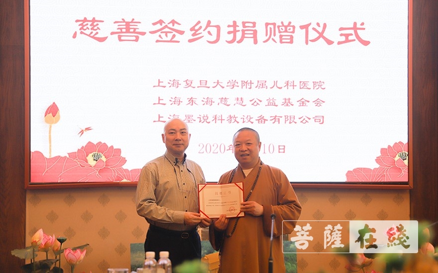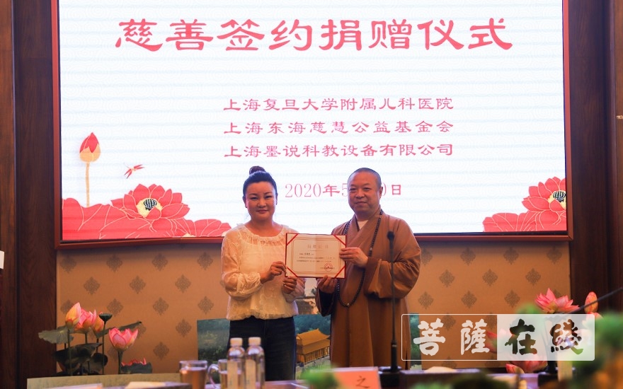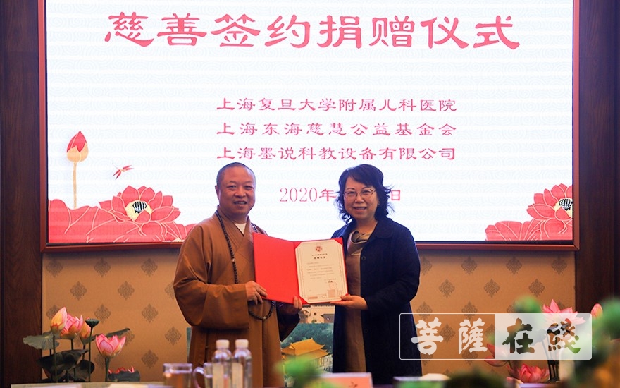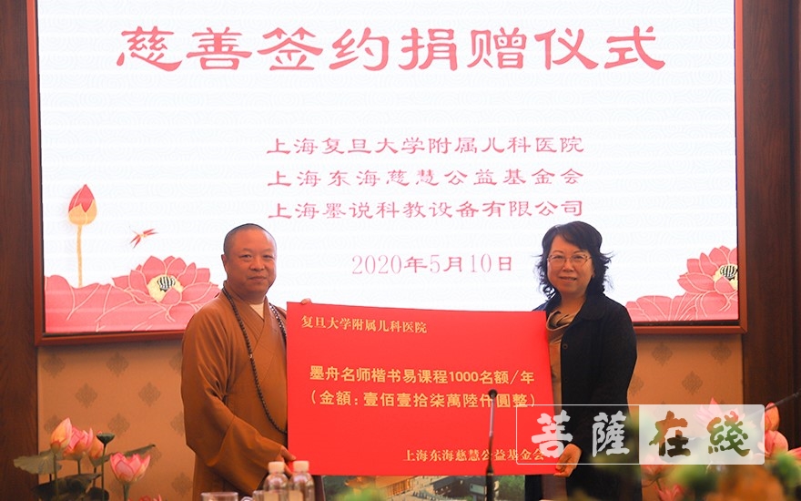 慧之法师代表东海慈慧公益基金会向复旦大学附属儿科医院捐赠墨舟线上课程(图片来源:菩萨在线 摄影:贺雪垠)