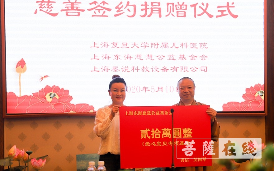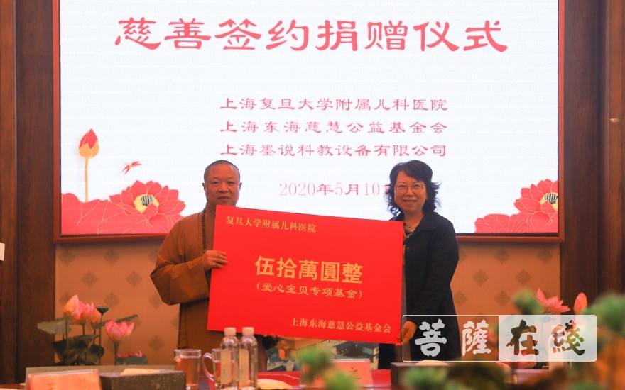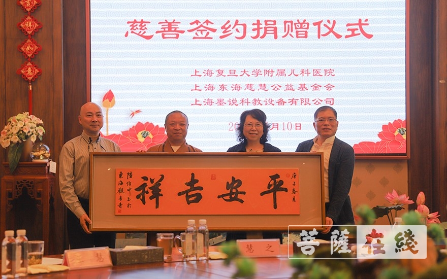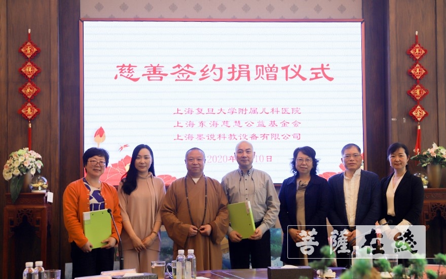 菩萨在线上海讯 5月10日上午10时,上海东海慈慧公益基金会与上海复旦大学附属儿科医院、上海墨说科教设备有限公司慈善签约及捐赠仪式在东海观音寺海潮阁举行。复旦大学附属儿科医院是这次新冠肺炎疫情儿童定点救治医院,医护人员付出大量的心血。基金会与理事单位上海墨说科教设备有限公司友好协商,并得到了儿科医院领导的支持,三方共同在东海观音寺举行了慈善签订仪式。