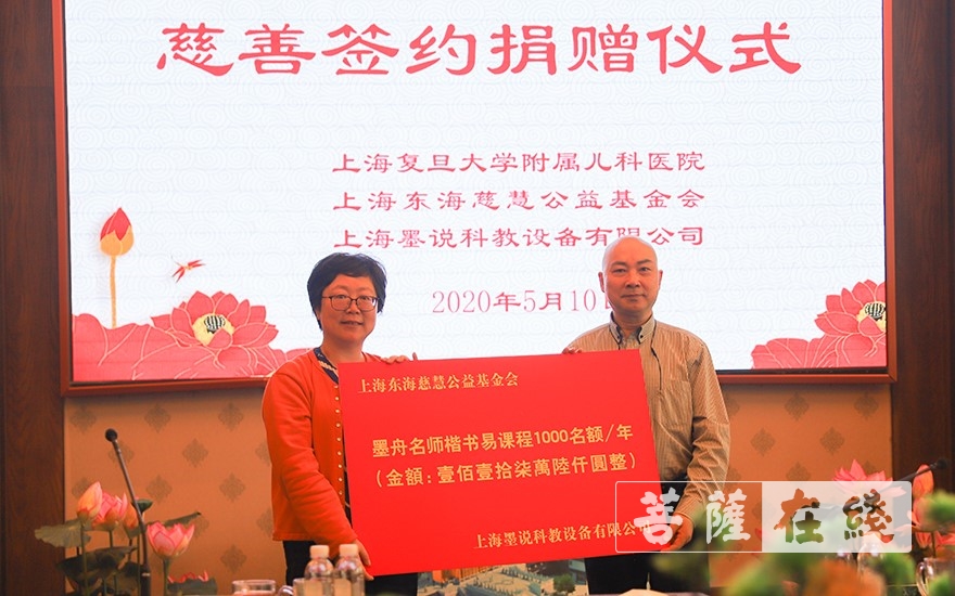 首先墨说方代表陆维中与基金会秘书长孙志祥进行了签订,墨说向基金会捐赠墨舟名师楷书易课堂1000个名额一年的支持,指定用于复旦儿科医院1000名医护人员线上书法的免费学习(价值壹佰壹拾柒万陆仟元),基金会理事长慧之法师向墨说颁发了捐赠证书。