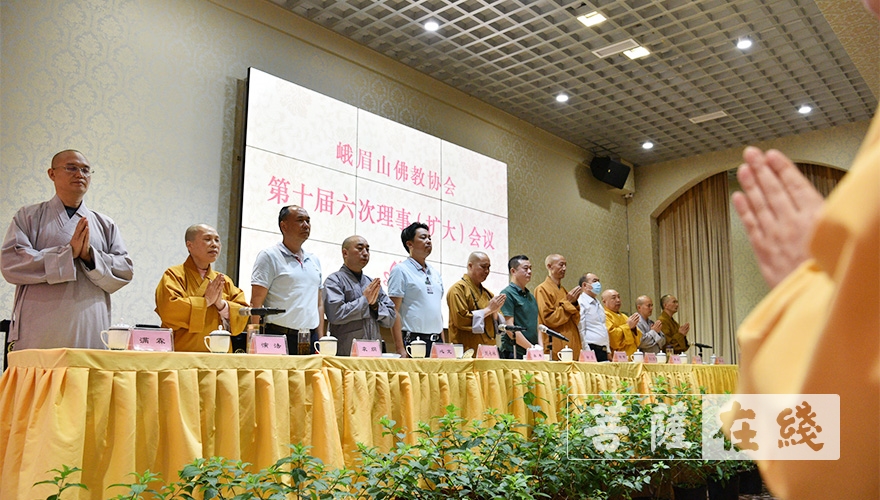 菩萨在线四川讯 5月25日,峨眉山佛教协会第十届六次理事(扩大)会议在大佛禅院行愿堂举行。峨眉山佛教协会会长永寿大和尚,副会长传智法师、心定法师、果正法师、演法法师、宏开法师、满霖法师,秘书长传法法师等第十届理事会全体理事以及佛协部份僧众、员工参加会议。