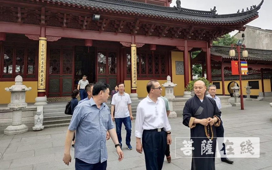 菩萨在线浙江讯 5月28日,嘉兴市民宗局副局长马继宁,绍兴市委统战部调研员吴军,柯桥区委统战部副部长、民宗局长陆建祥等一行走访安康寺,检查寺院疫情期间暂停开放的引导工作和停止宗教活动的落实情况。安康寺方丈法弘大和尚接待调研组。
