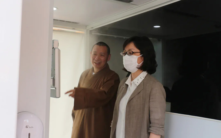 在寺院山门入口,领导们一行体验了智能防疫工作站的使用过程。慧平大和尚介绍,为切实保护恢复开放后信众的健康安全,也为寺院后续开放保驾护航、提供方便,七宝教寺专门采购2台智能防疫工作站;该工作站功能包括口罩识别、体温测量、人脸考勤打卡、手部消毒、全方位雾化消毒,实现全程无接触,避免交叉感染。