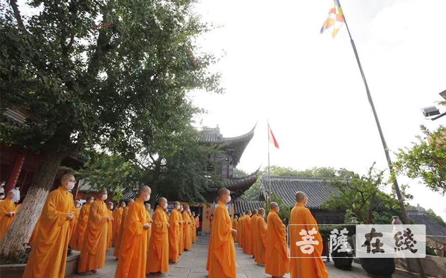 9日上午7时,鸡鸣寺住持莲华法师率全寺僧众、职工、义工以及江苏尼众佛学院师生在毗卢宝殿前举行升国旗仪式,以弘扬抗疫爱国主义精神,祈愿祖国富强、社会和谐、人民幸福。