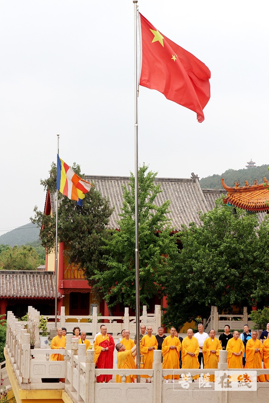 菩萨在线江苏讯 6月9日,徐州云龙山兴化禅寺举行升国旗仪式。兴化禅寺方丈果光大和尚率全体僧众以及护法居士,参加升旗仪式,祈愿国泰民安,佛光普照。