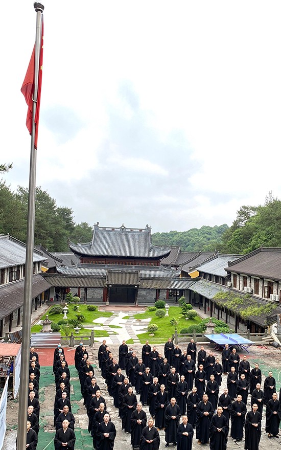 菩萨在线浙江讯 6月7日,雪窦山华林讲寺开放首日,为弘扬抗疫爱国精神,秉承佛教界爱国爱教的优良传统,寺院组织全体僧众举行了升国旗仪式。