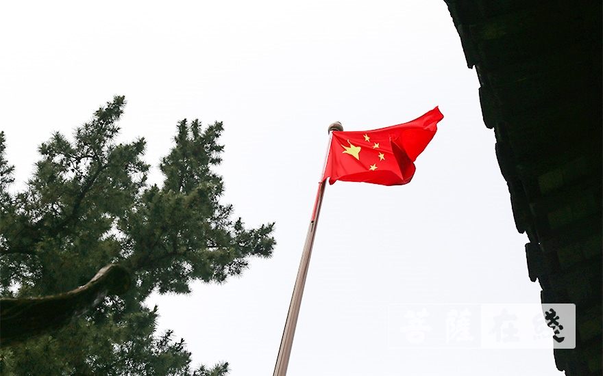 在高亢的国歌声中,鲜红的五星红旗冉冉升起,全体僧众向国旗行注目礼,注视着国旗在兴福寺上空高高飘扬,满怀崇敬之情送上对祖国最美好的祝福。