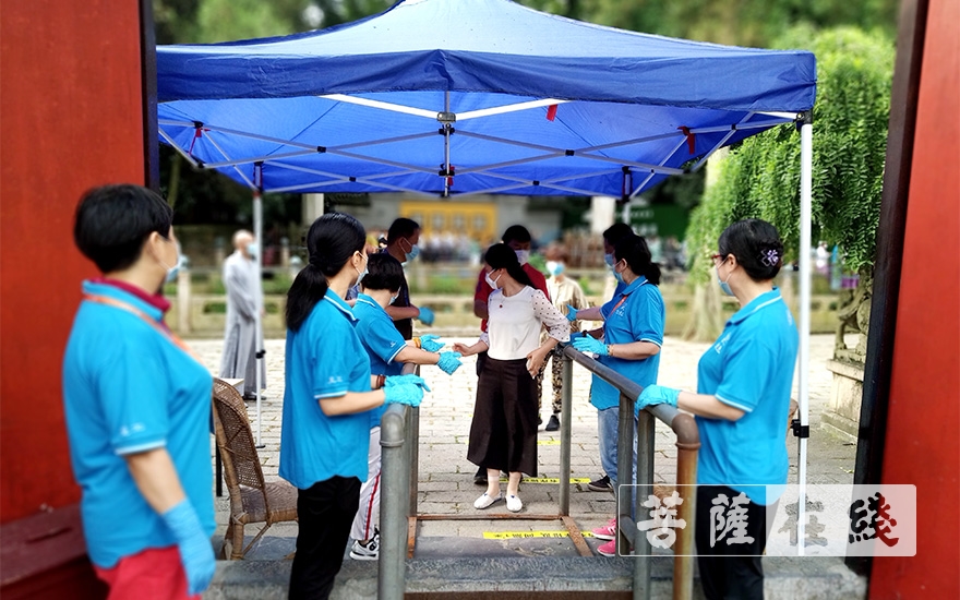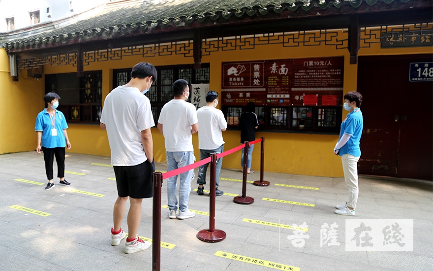 入寺人员在山门口有序排队
