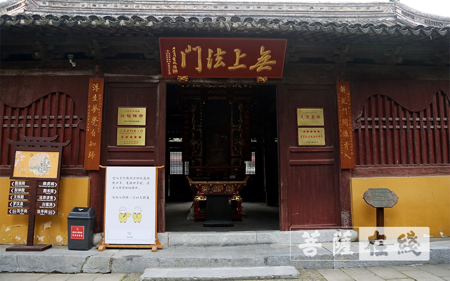山门口设置有“测温扫码 有序入寺”指示牌