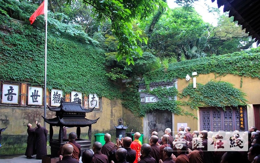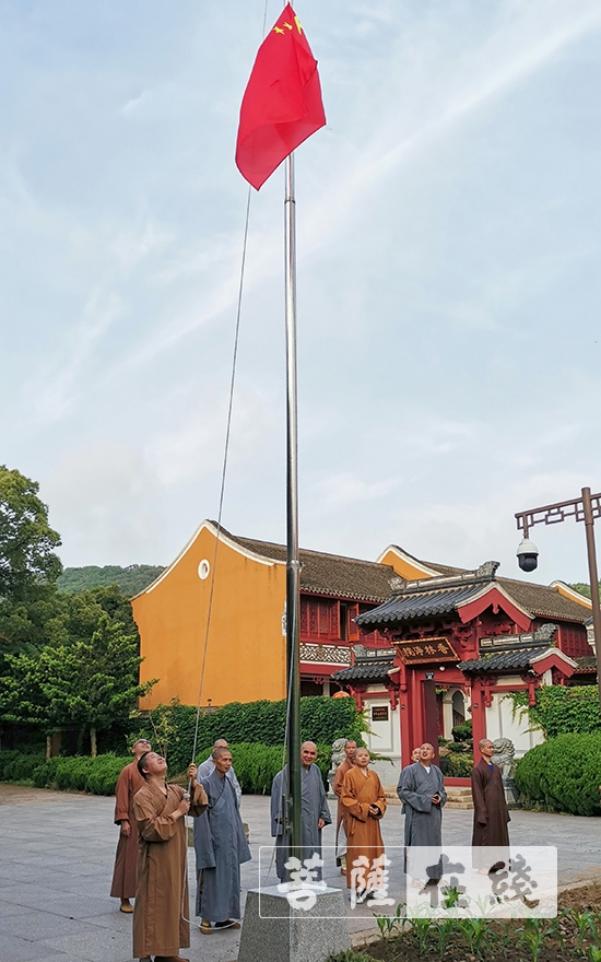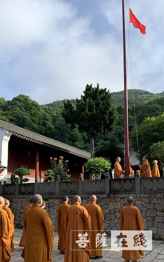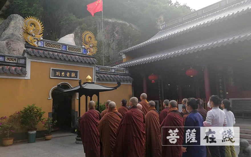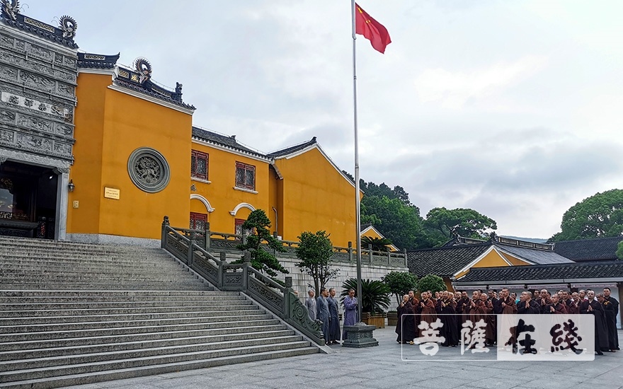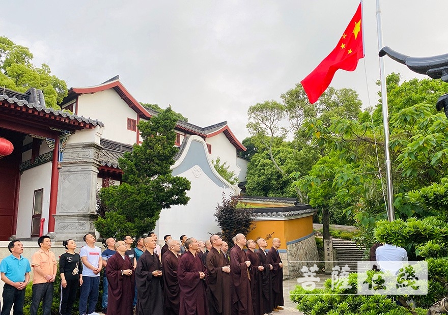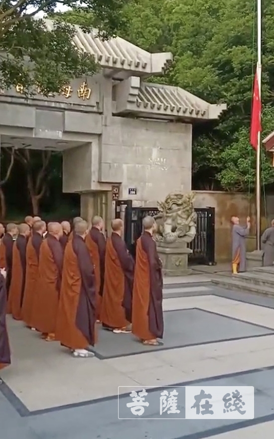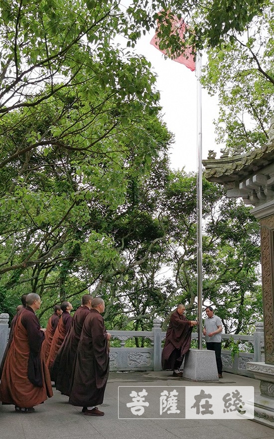 菩萨在线浙江讯 6月2日,为大力弘扬抗疫爱国精神,普陀山佛教协会在此次全省宗教活动场所有序恢复开放首日,组织全山各寺院举行了庄严肃穆的升国旗仪式。