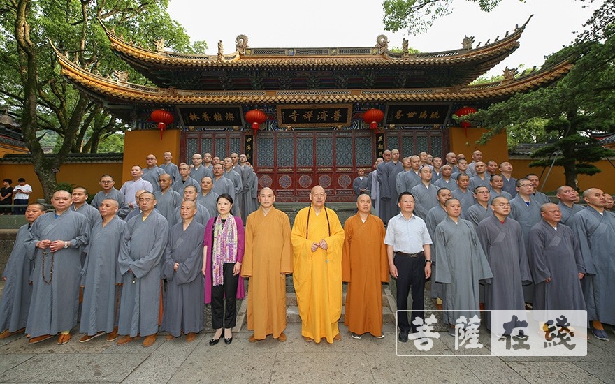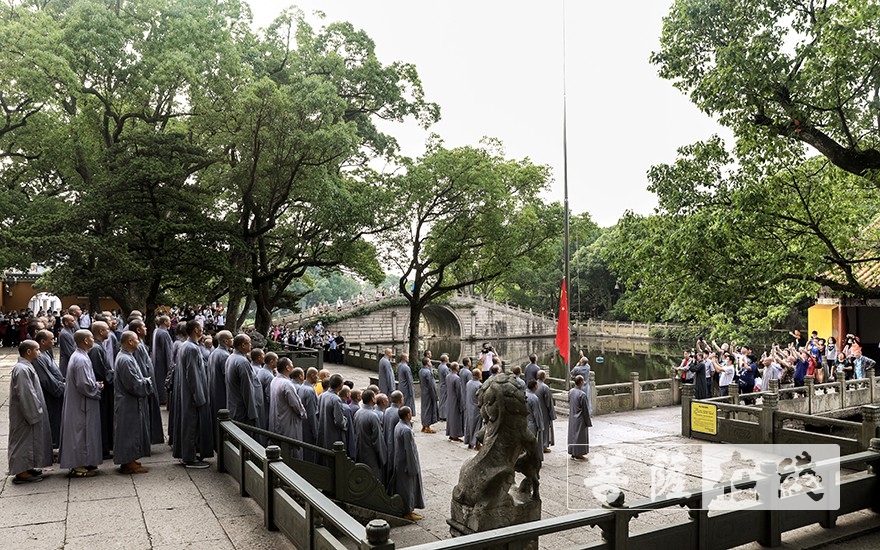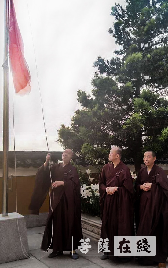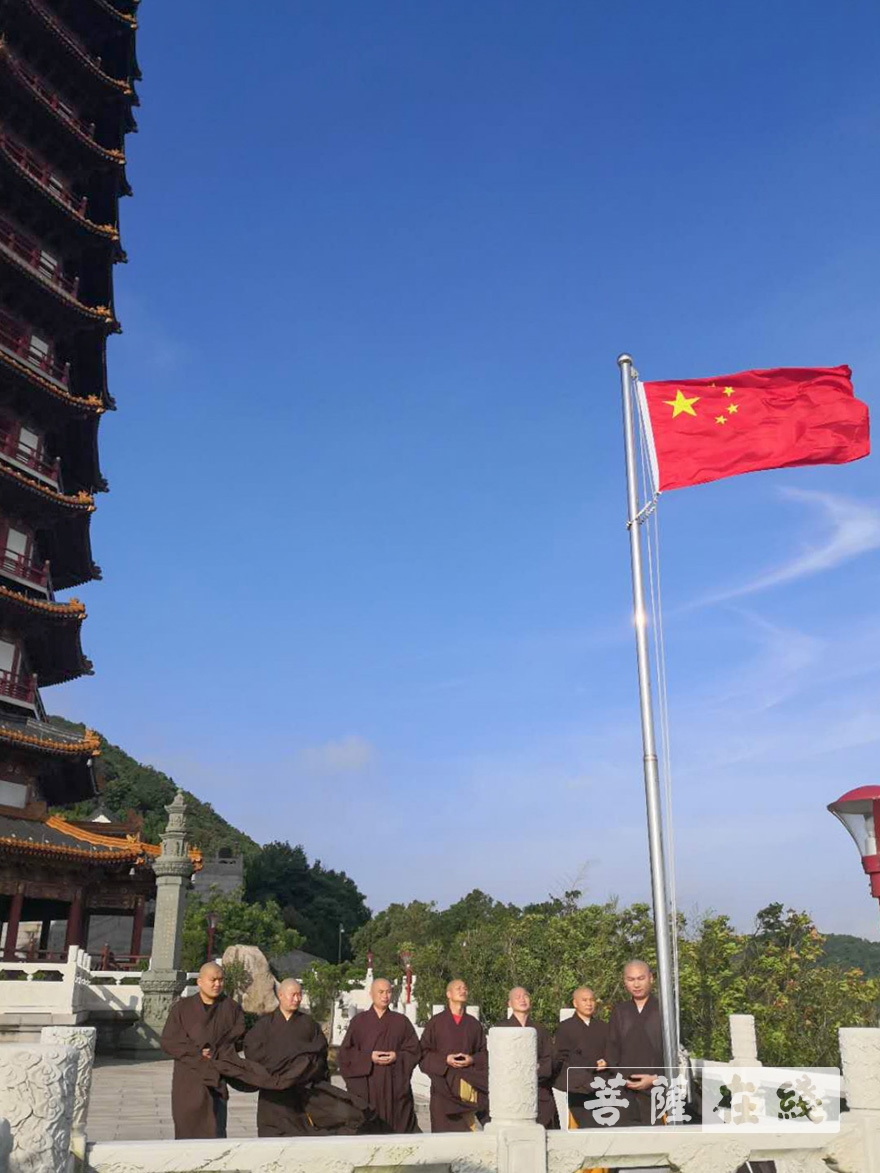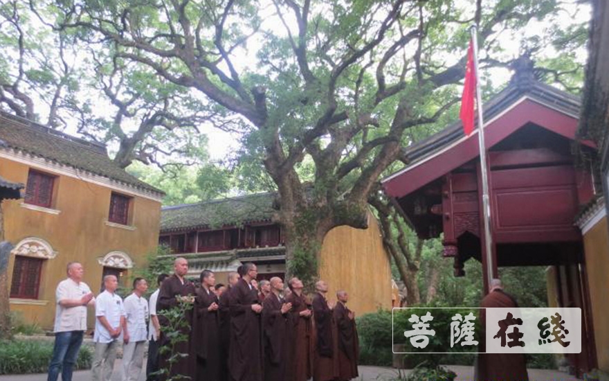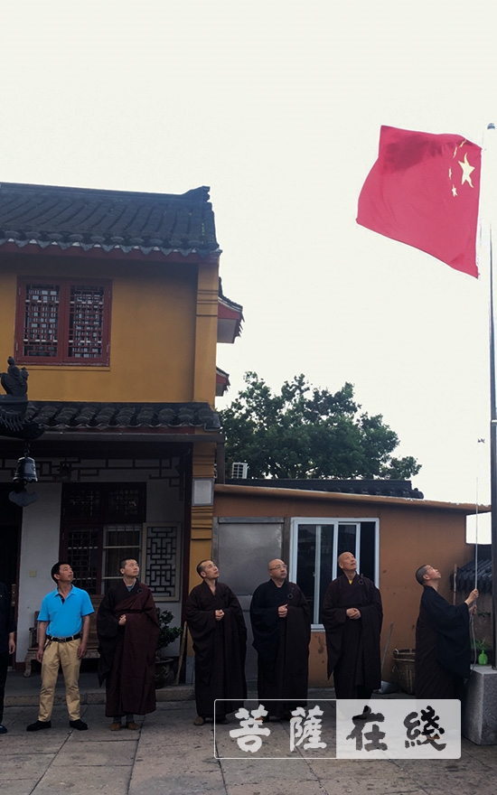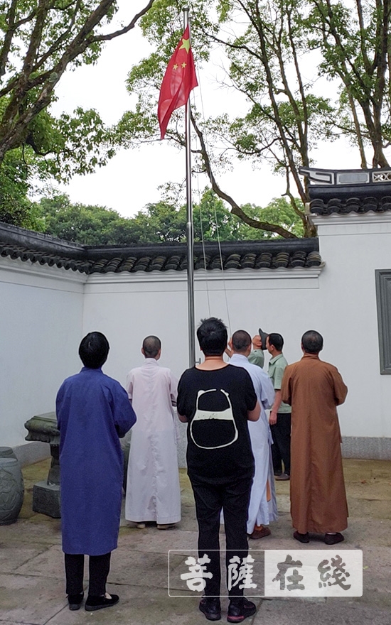 中国佛教协会副会长、普陀山佛教协会会长、中国佛学院普陀山学院院长、普济禅寺方丈道慈大和尚,市委统战部副部长、市民宗局局长周开龙,普朱管委会副主任蔡敏波,普陀山佛教协会副会长兼秘书长门肃法师,普陀山佛教协会副会长定明法师,佛教协会会本部、普济禅寺两序大众在普济禅寺山门前参加升国旗仪式。