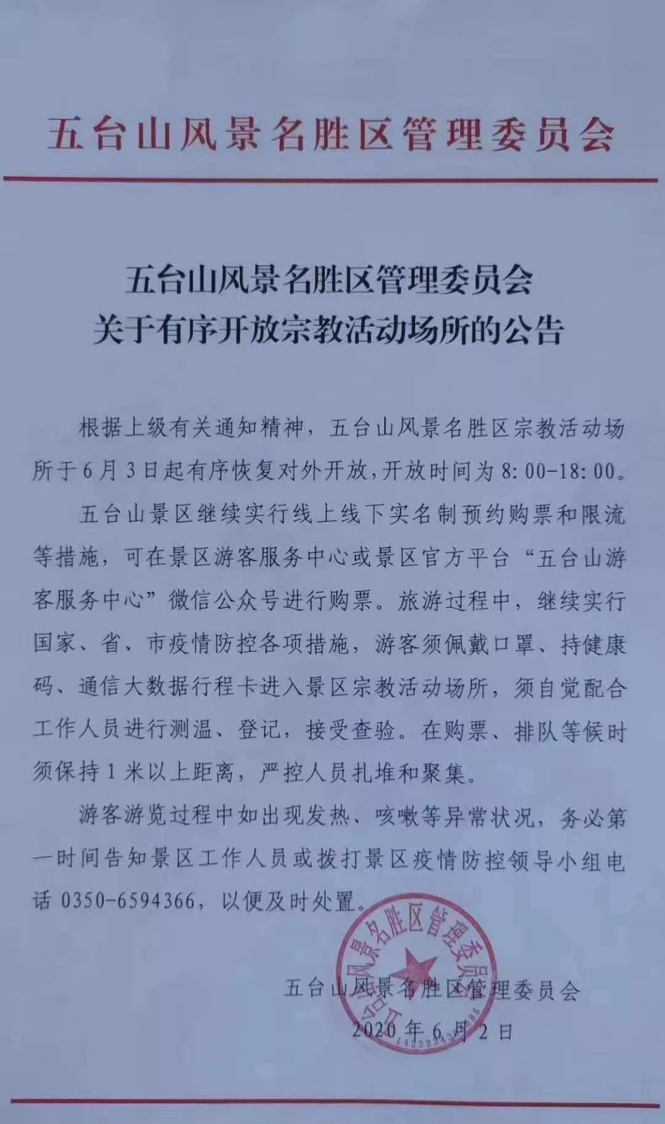 菩萨在线山西讯 6月2日,五台山风景名胜区发布《关于有序开放宗教活动场所的公告》。公告原文如下: