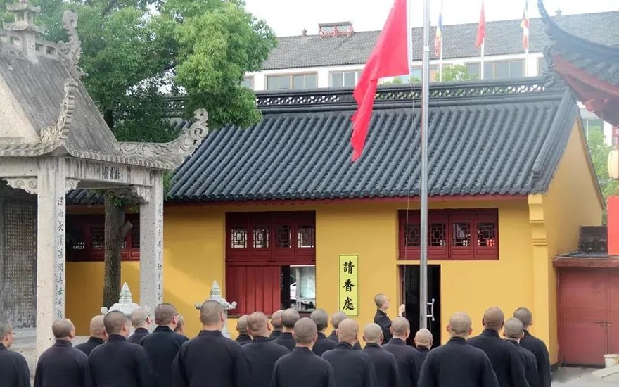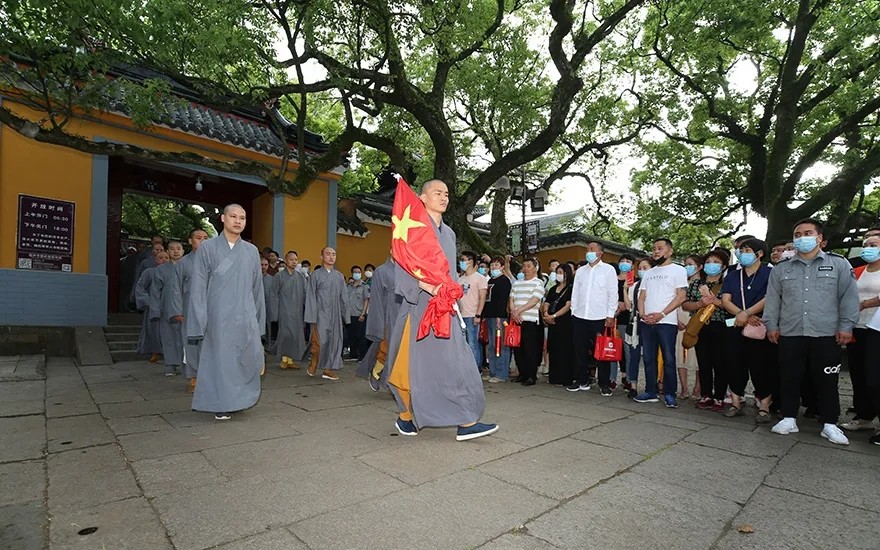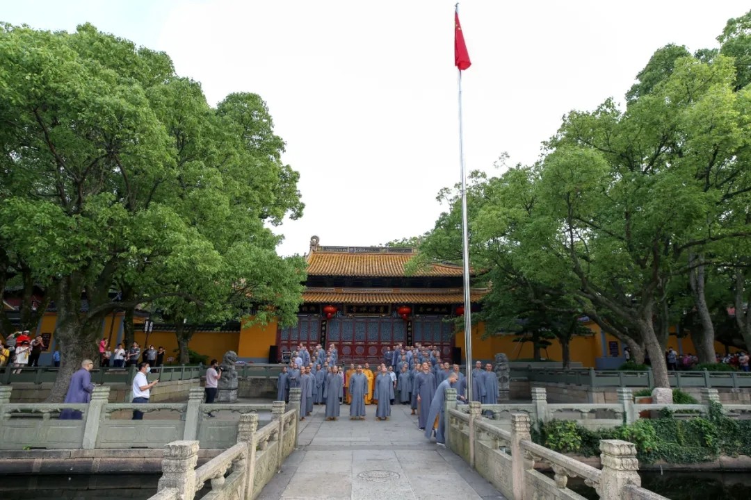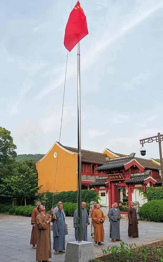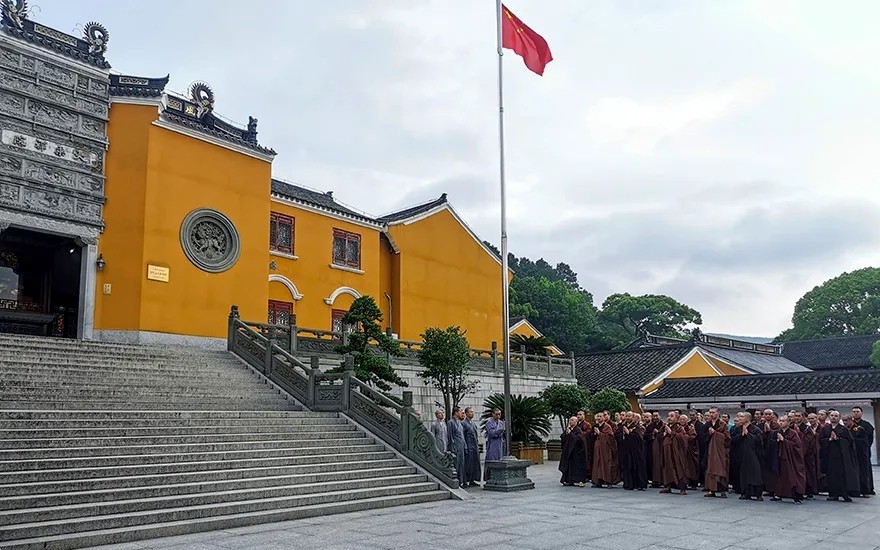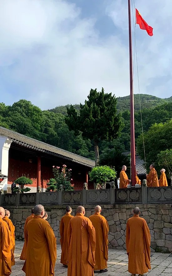 漫长的等待后,浙江省首批寺院重开山门,第一时间就将鲜艳的五星红旗高高升起,庄严的升旗仪式,肃穆的注目礼下,是佛子们对祖国的一片赤诚之心。