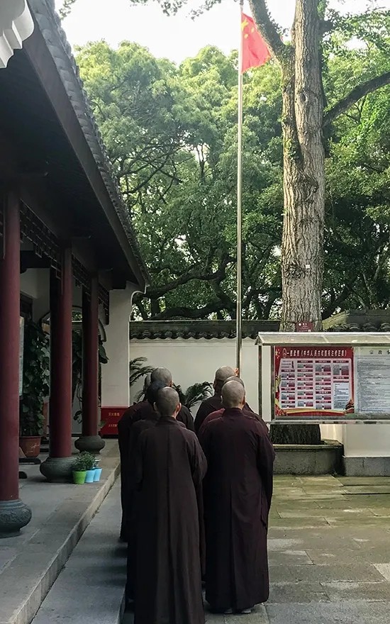 天童禅寺全体法师参加升国旗仪式,并行注目礼(摄影:崇和法师)