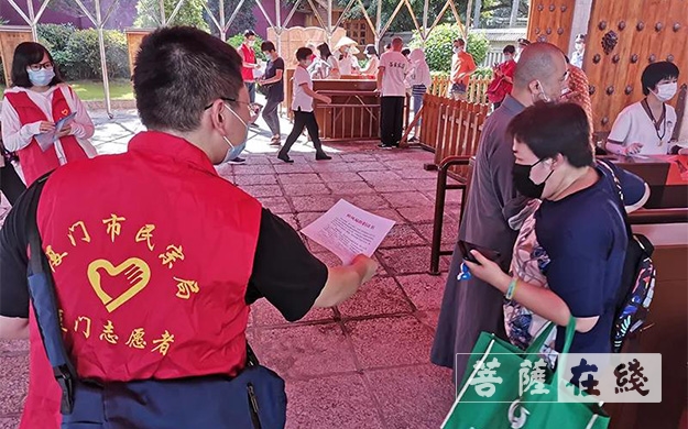 当天上午,苏清臻和张智副还带领市民宗局志愿服务队7位志愿者在南普陀寺东山门开展志愿服务,在炎炎夏日服务游客信众,协助维持现场秩序,帮助群众在线通过南普陀寺小程序预约入寺,现场发放《宪法及法律法规宣传页》《平安厦门宣传页》《公共安全手册》《旅游观光不任性 健康出行共战疫倡议》等材料,为信众游客开展宪法法律法规宣导、文明新风、平安建设宣传,劝导佩戴口罩,提升民众防疫意识。