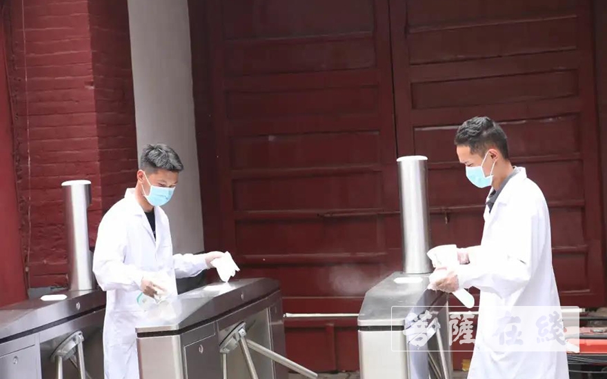 少林寺聘请专业人员对进入寺院的闸机展开消毒工作