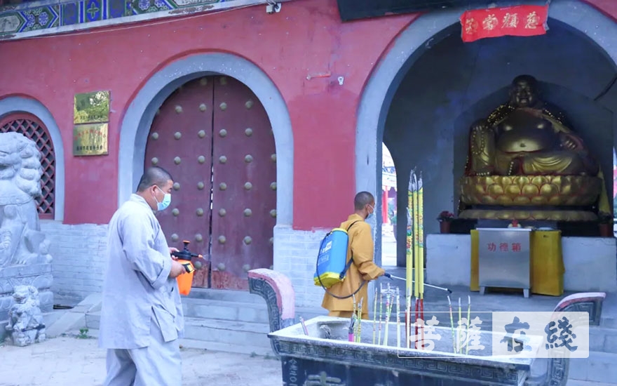 僧众对寺院各处进行消杀菩萨在线河南讯 自“双暂停一延迟”以来,新郑观音寺已关闭山门数月。在党和国家的正确带领下,在统战部、宗教局领导的关怀指导下,在保证防控组织到位、防控物资到位、应急预案到位、内部管理到位和宣传教育到位的前提下,7月18日,新郑观音寺恢复开放。