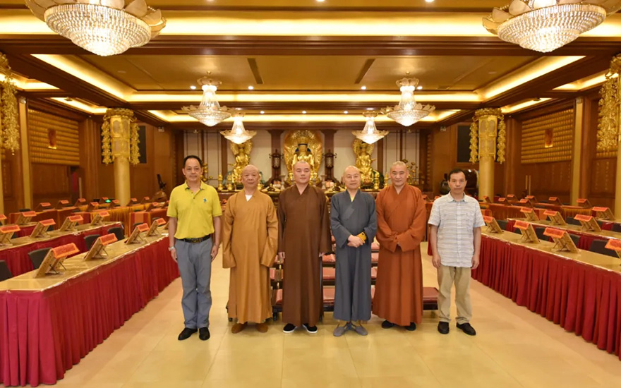 菩萨在线浙江讯 7月16日,由浙江省佛协副会长光泉法师带队,浙江省佛协秘书长金幸祥,湖州市佛协会长慈满法师,嘉兴市佛协会长峙宇法师,省佛协本部本戒法师及余霖组成的省佛协调研组一行至长兴寿圣寺,就贯彻中佛协《坚持佛教中国化方向五年工作规划纲要(2019—2023)》做相关调研指导。