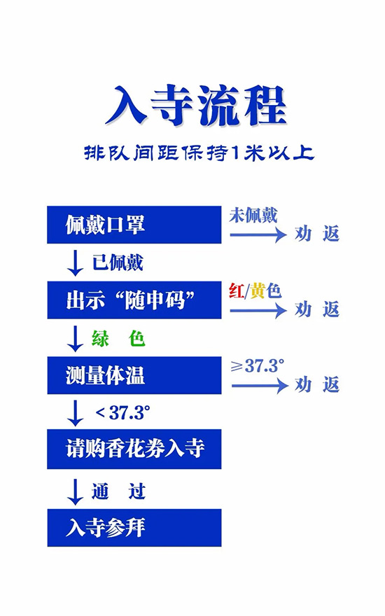 2.入寺请自觉戴好口罩,配合测量体温。超过37.3℃者,谢绝入寺。