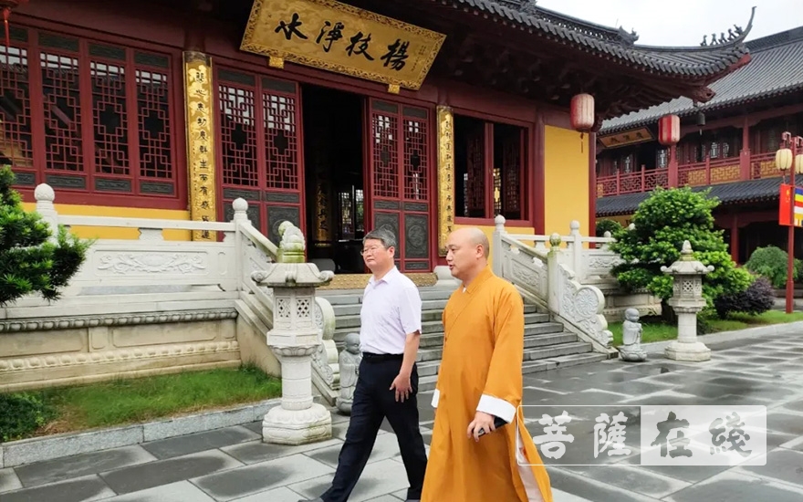 法弘法师带领熊俊龙局长一行参观寺院主要殿堂。参访团一行人对寺院的管理及殿堂建筑表示赞叹。