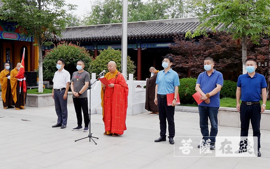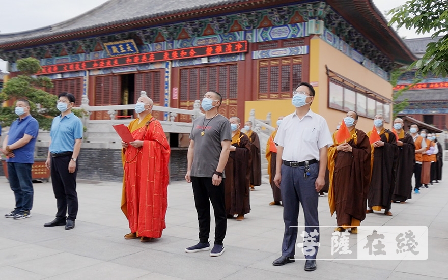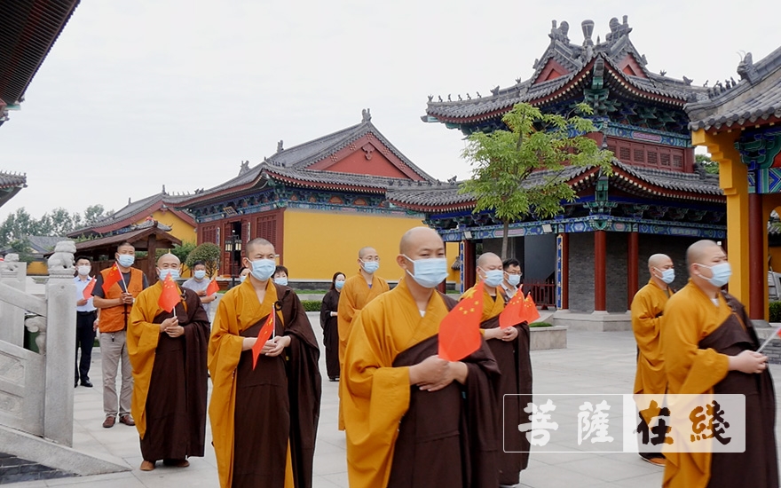菩萨在线山东讯 自1月24日贯彻落实“双暂停、一延迟”以来,胶州慈云寺已深锁山门158天。在经过有关部门多次评估寺院常态化防疫工作措施等条件后,胶州慈云寺已符合恢复开放标准。6月30日,慈云寺山门重启,并于开放首日举行庄严的升国旗仪式。
