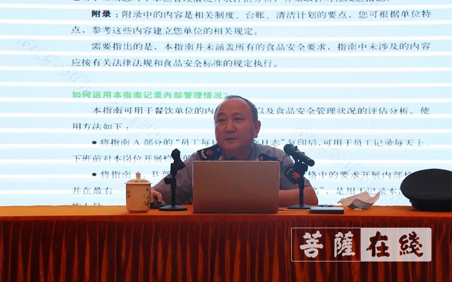讲座正式开始,刘长青从基础管理工作、重点环节管理措施、管理评估和改进三大部分,对疫情防控与食品安全知识做了系统讲解,并就食品从业人员、场所和设施设备、原辅料采购贮存、食品制作供应、冷菜生食处理、餐具用具清洁六大重点,特别进行重点解读;最后,还对如何发挥佛教素食的特长和优势提出宝贵建议。
