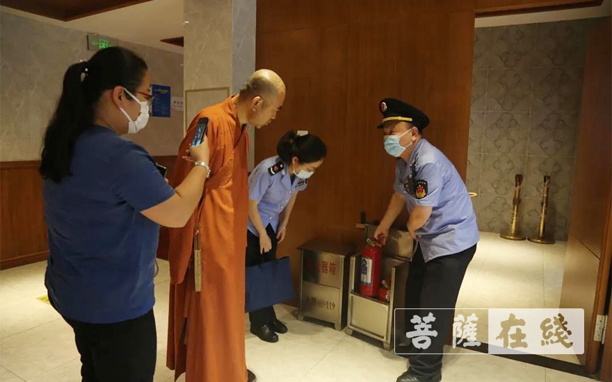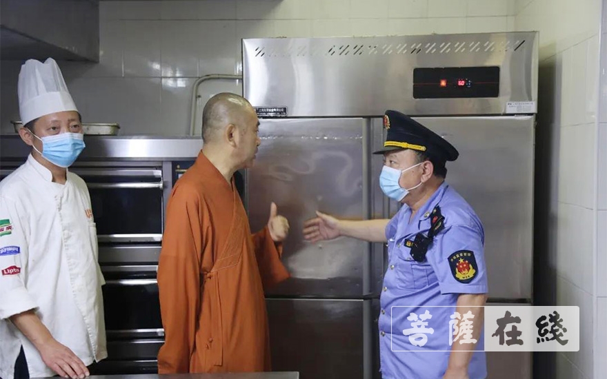 讲座结束后,应平熹大和尚邀请,刘长青一行还在宁国禅寺进行专题巡查,对宁国禅寺疫情防控和食品安全措施作现场督察、指导,并提出改进意见。