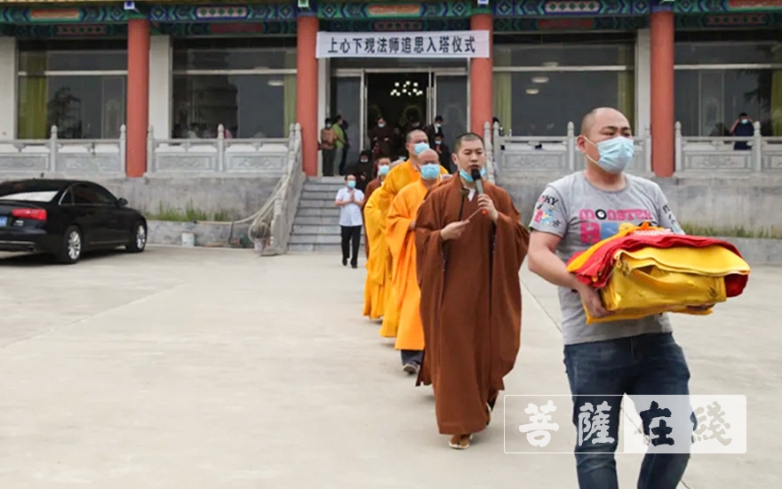 菩萨在线山东讯 心观老和尚灵骨追思入塔法会7月10日在枣庄甘泉寺举行,此次法会是为安放心观老和尚灵骨,并以此为契机对心观老和尚进行集体追思。此前,心观老和尚已于2020年5月6日下午两点圆寂。世寿五十六岁,僧腊廿七年。心观老和尚生前爱国爱教,多年来致力于弘扬佛法,扶持教育,热心公益,服务社会,广受各界尊重。众人致辞悼念心观老和尚法会现场庄严肃穆,前来追思者众多。枣庄市佛教协会副会长、枣庄市市中区佛教协会会长、甘泉寺住持惟正大和尚,枣庄市市中区佛教协会副会长兼秘书长、法悟法师枣庄市市中区佛教协会副会长金殿忠,枣庄市市中区佛教协会副会长孙中桥,枣庄市市中区佛教协会副会长牛飞雁以及枣庄市甘泉寺全体法师、 护法居士三十余人参加追思入塔仪式。送灵骨入塔心观老和尚的家属及到场领导先后致辞,表达对心观老和尚的尊敬与追思,之后惟正大和尚也进行了开示。随后,入塔仪轨法事在莲池海会堂举行。心观老和尚塔碑法会最后,在众人的注视下,心观老和尚灵骨被庄严送入塔林,灵骨安放在塔内。