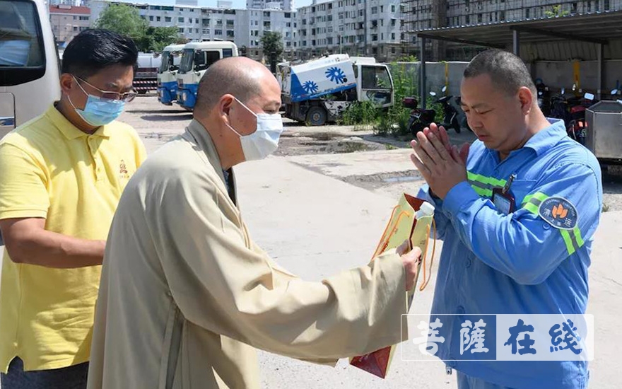 随后,长春法师一行至普陀区环卫公司应急休息点,送去防暑降温用品,关照他们注意防暑降温,劳逸结合,“高高兴兴上班,平平安安下班”。