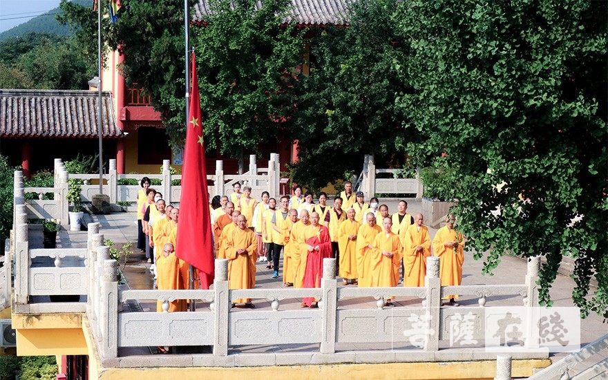 菩萨在线江苏讯 为庆祝中国人民解放军建军93周年,并响应全国性宗教团体联席会议关于号召全国宗教活动场所升挂国旗的倡议,8月1日早上8时整,徐州云龙山兴化寺僧俗两众近100余人在天王殿前举行升旗仪式。
