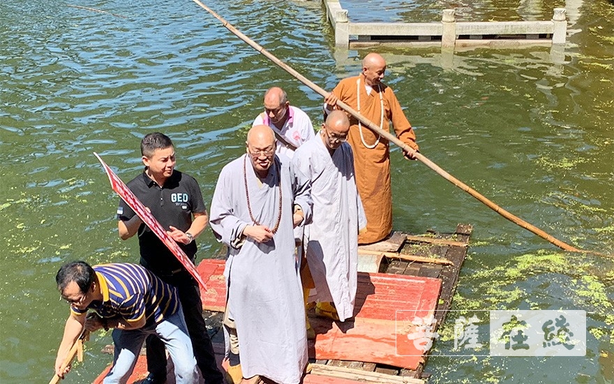 圣辉法师一行乘坐木筏前往寺院