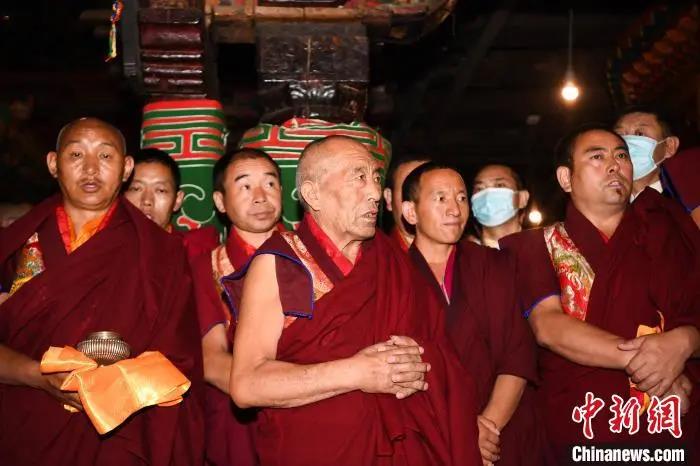 5时40分左右,法号骤响、桑烟腾起,暮色与小雨中,班禅一行抵达,众人翘首以待。由手持香炉、黄伞的高僧及吹唢呐的仪仗队引路,班禅缓步走入大昭寺,逐一朝拜甘丹拉康、观音殿等。每到一处,班禅都念诵经文、虔诚祈祷,并向佛像敬献哈达。