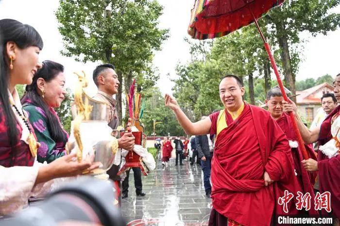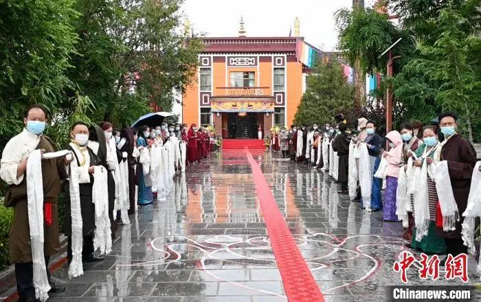 在位于拉萨的雪林多吉颇章内,各族各界信众身着盛装、手捧哈达,列队欢迎班禅回藏