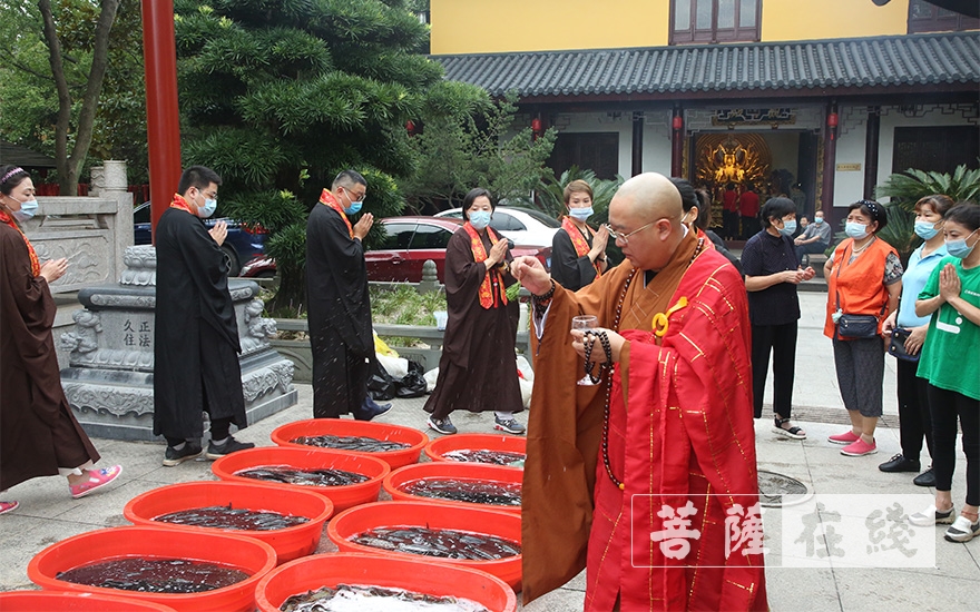 早上6时,圆通宝殿内诸位法师,双班排列,威仪具足。明非大和尚洒净加持放生物命,于法座上宣说十二因缘,为物命授持三皈依等佛教法义。在观世音菩萨成道日举行放生法会,是让放生物命与观世音菩萨结缘,令诸众生,种菩提善因,得离轮回恶道。