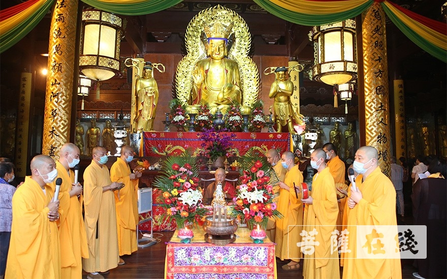 上午9时,圆通宝殿内观音如来法相清净庄严,诸法师举腔引赞,明非大和尚拈香礼佛,与众等善信,共同顶礼观音如来。