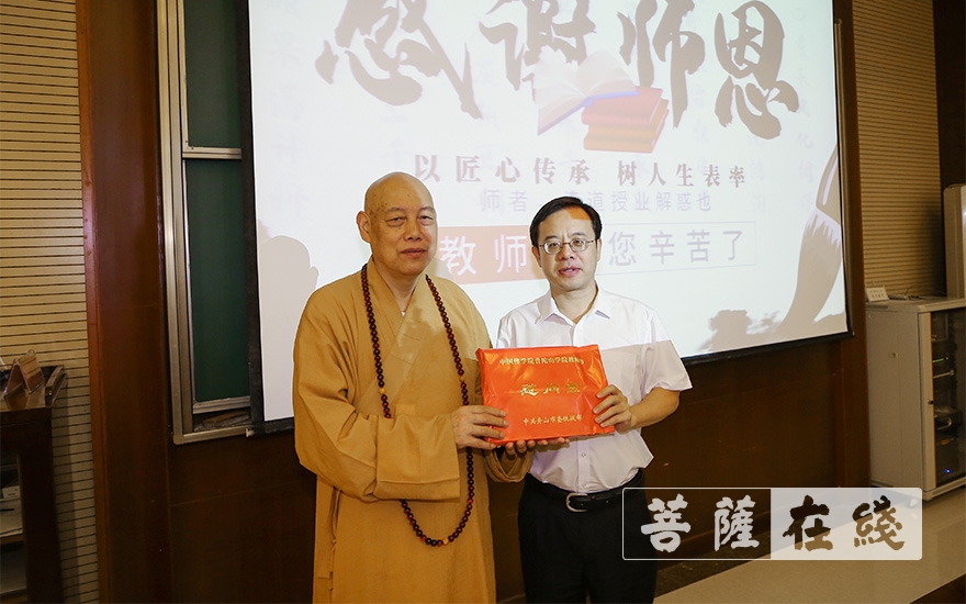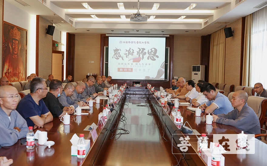 菩萨在线浙江讯 9月10日上午,在全国第36个教师节来临之际,舟山市委常委、市委统战部部长王高瞻,中国佛教协会副会长、普陀山佛教协会会长、中国佛学院普陀山学院院长、普济禅寺方丈道慈大和尚,市委统战部副部长、市民宗局局长周开龙,市委统战部办公室主任黄旻昊等一行前往中国佛学院普陀山学院进行教师节慰问。