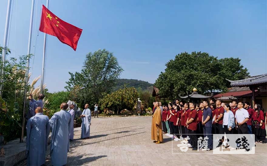 在庄严的升旗仪式中,在场嘉宾、法师、学员肃穆而立,集体面向五星红旗行注目礼,这是书院师生进行爱国主义教育的重要环节。