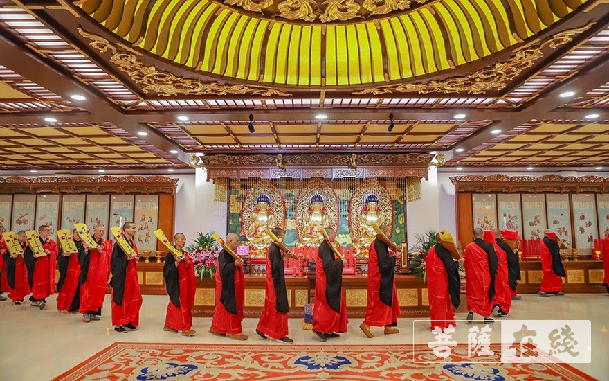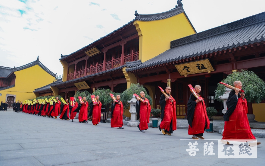 法师们肩扛香盘移步至大雄宝殿(图片来源:菩萨在线 摄影:妙月)