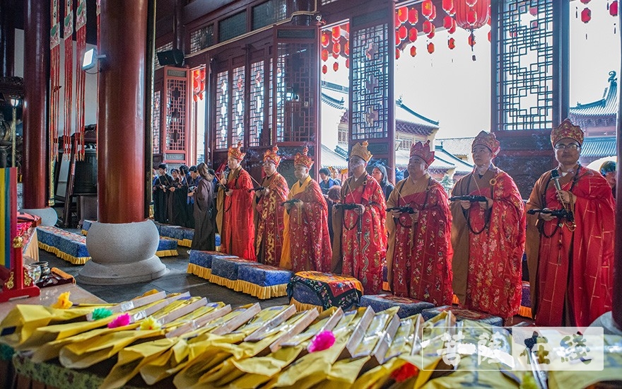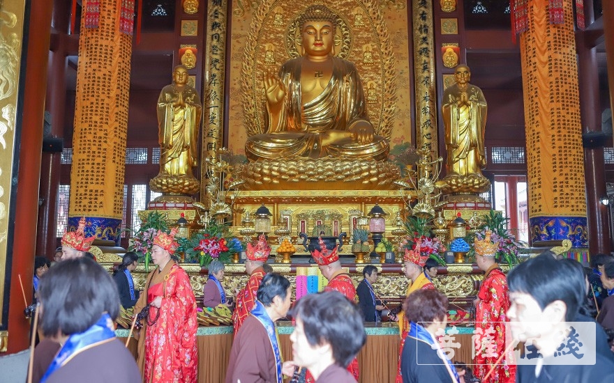 上午10时30分,锣鼓喧天,梵音清扬,法师们肩扛香盘移步至大雄宝殿。仪仗队手持香、花、灯、宝盖两厢站立,主法法师为上下堂二十四席洒净,并率领众功德主奉请圣驾,齐心恭送十方法界诸佛菩萨圣众请登云路,六道圣凡及诸眷属往生极乐净土。