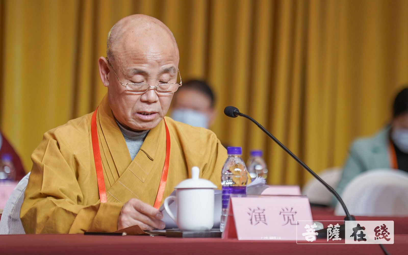 新任会长演觉法师在闭幕会上讲话。他对今后五年中国佛教协会工作提出六点展望:
