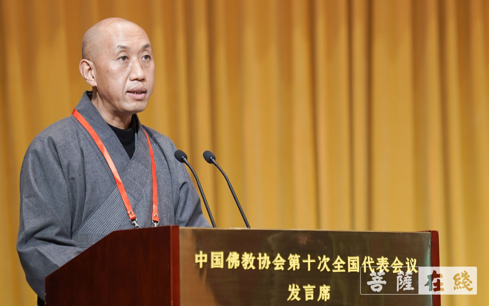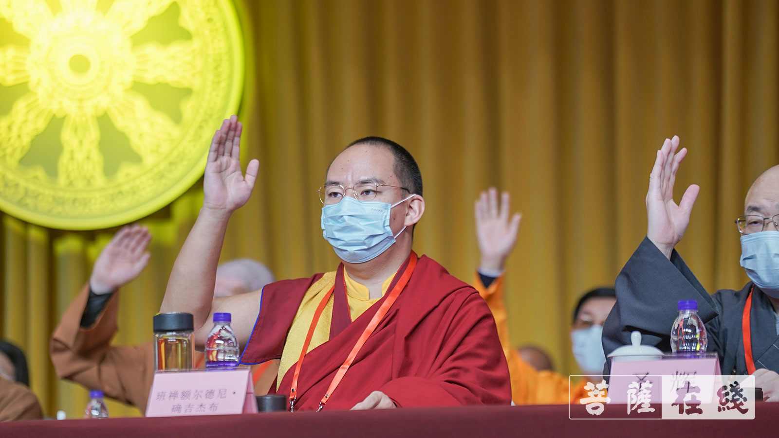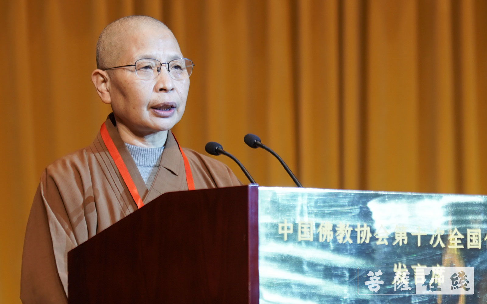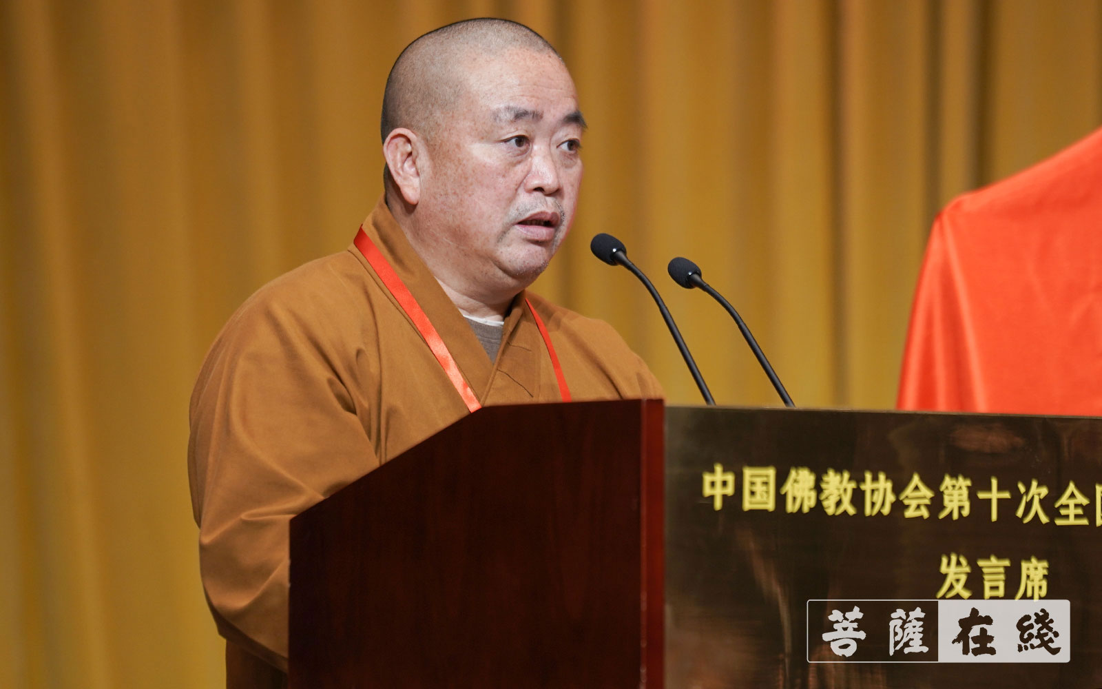 会议一致通过《中国佛教协会第十次全国代表会议决议》。图为中国佛教协会副会长明生法师宣读《中国佛教协会第十次全国代表会议决议(草案)》