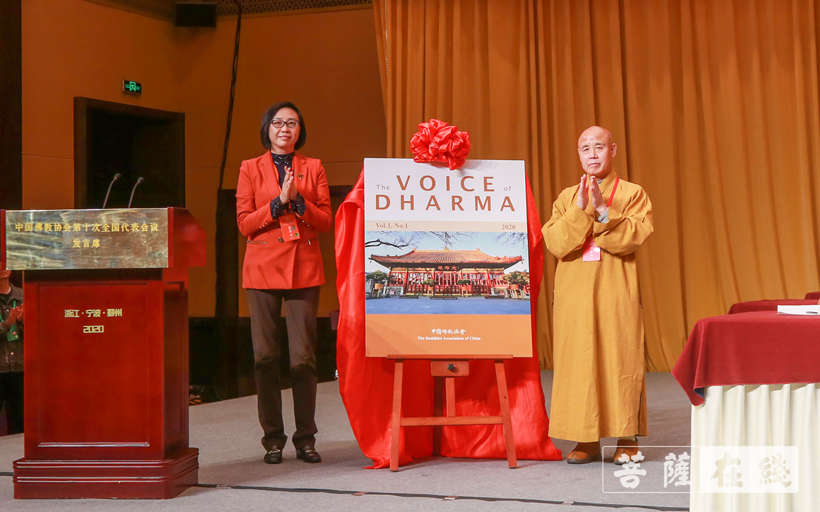闭幕会上,中央统战部有关部门负责人、中国佛教协会会长演觉法师为《法音(英文)》期刊创刊号展示牌揭幕